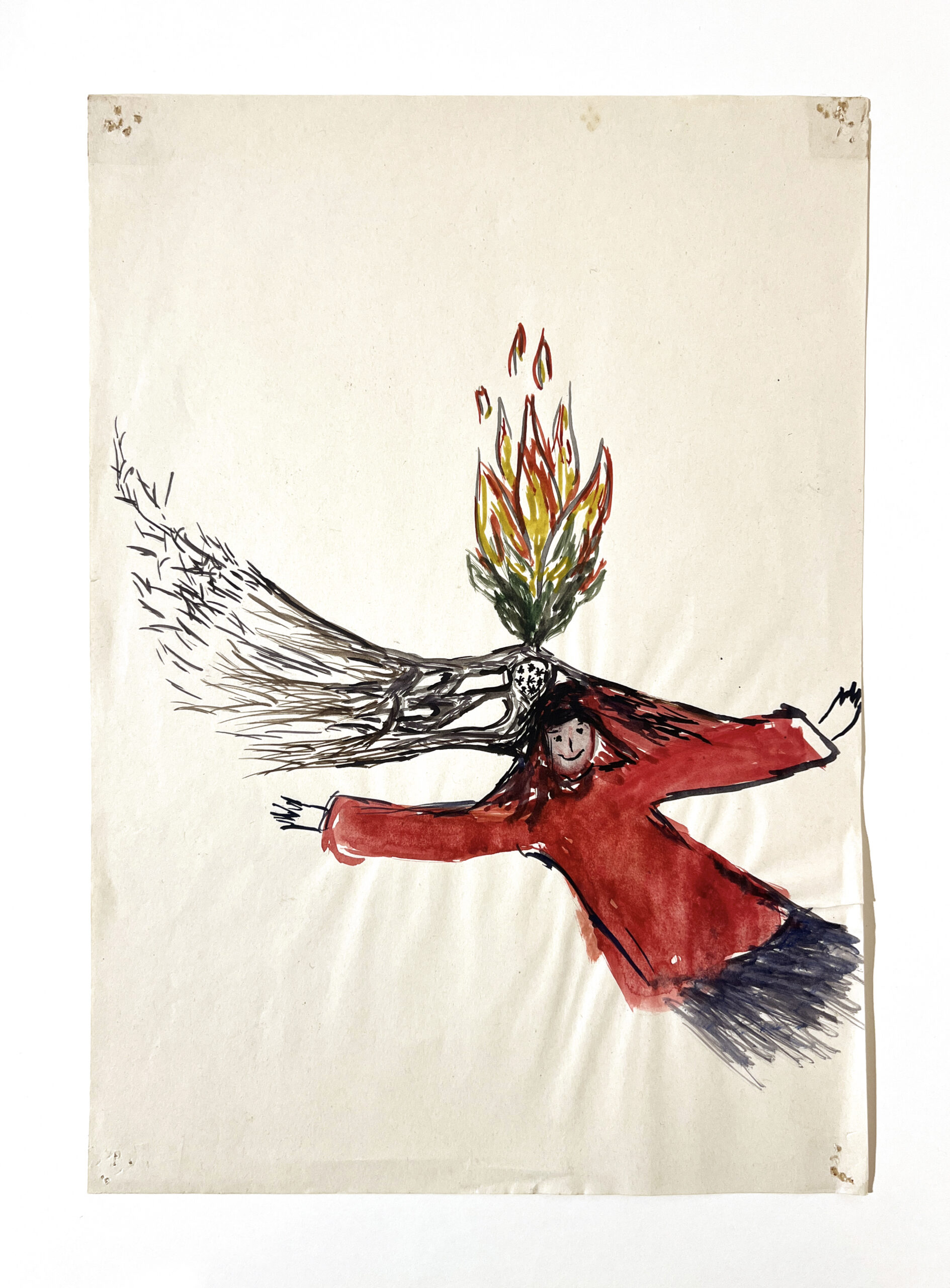 The current exhibition at Kisterem Gallery focuses on Anikó’s most important medium, her work on paper. These intimate-sized works were created with pencil, watercolor, ballpoint pen, crayon, felt-tip pen, paper cutouts, or even a typewriter, mostly on simple A4 or A5 sheets of paper or in sketchbooks. From 2003, at the time she became a mother, drawing at home in the evenings became part of Anikó’s daily routine, resulting in more than two thousand smaller works created until her death.